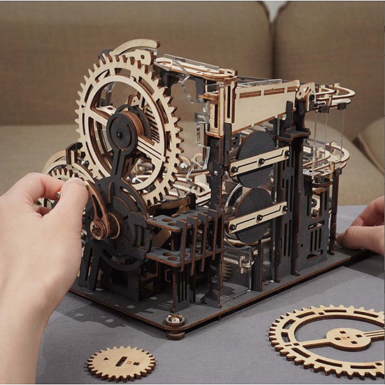 De LGA01 Marble Night City is een handgemaakte knikkerbaan bestaande uit 294 laser gesneden houten onderdelen en 10 knikkers.